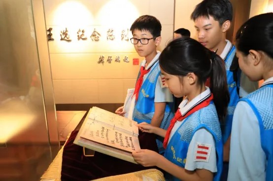 纪念陈列室的“生平事迹厅”系统地展示了王选院士献身科学、无私奉献的一生。科技小记者们仔细阅读密密麻麻的科研手稿、富含哲理的人生格言;认真聆听关于朴素节俭的衣物用品、数十张发黄的捐款收据,以及荡气回肠的王选遗嘱背后的故事。